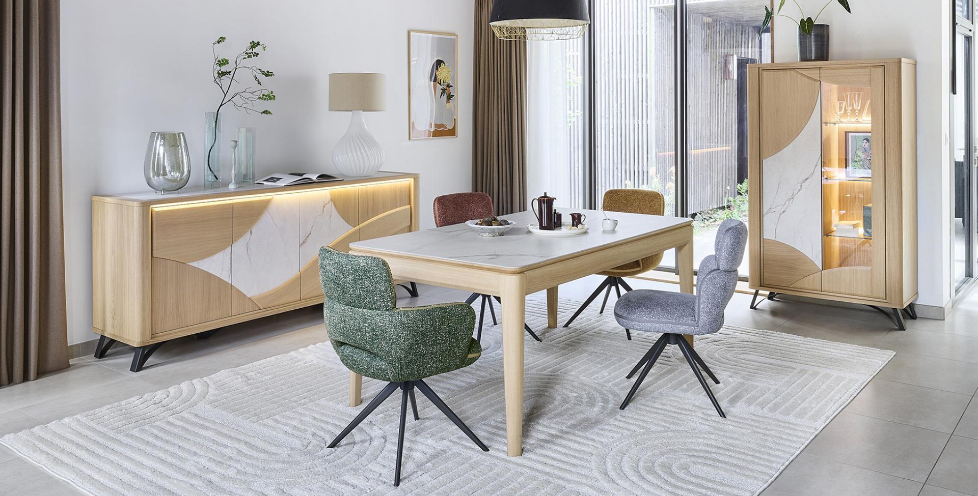 Complétez votre ensemble avec la vitrine RIVIERA assortie et nos chaises design, pour un intérieur haut de gamme et harmonieux.