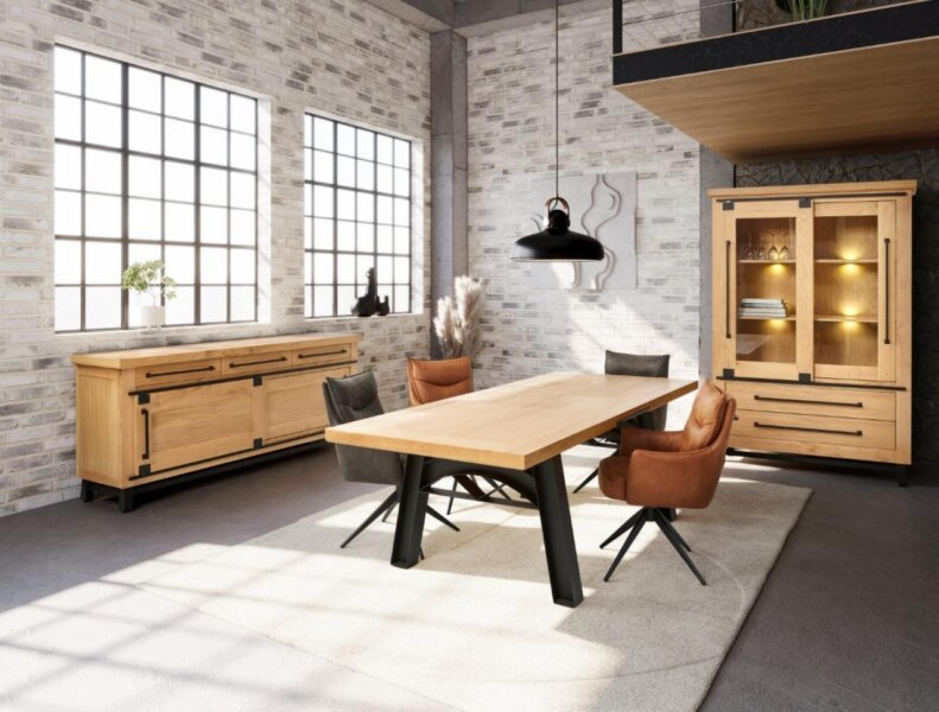 La collection de salle à manger Mont Blanc est conçue pour les intérieurs qui célèbrent le mariage des matières nobles. Elle se distingue par l'utilisation de chêne massif (et placage) à la fois sur le buffet et la table repas, offrant une durabilité exceptionnelle. Le design est rehaussé par des éléments métalliques noirs (poignées coulissantes, cadre du vaisselier et piètement de la table) qui ancrent l'ensemble dans un style industriel chic et chaleureux. Que vous recherchiez un buffet bas pour votre salon ou un grand vaisselier vitré pour votre vaisselle, la collection Mont Blanc apporte robustesse et caractère à votre pièce."