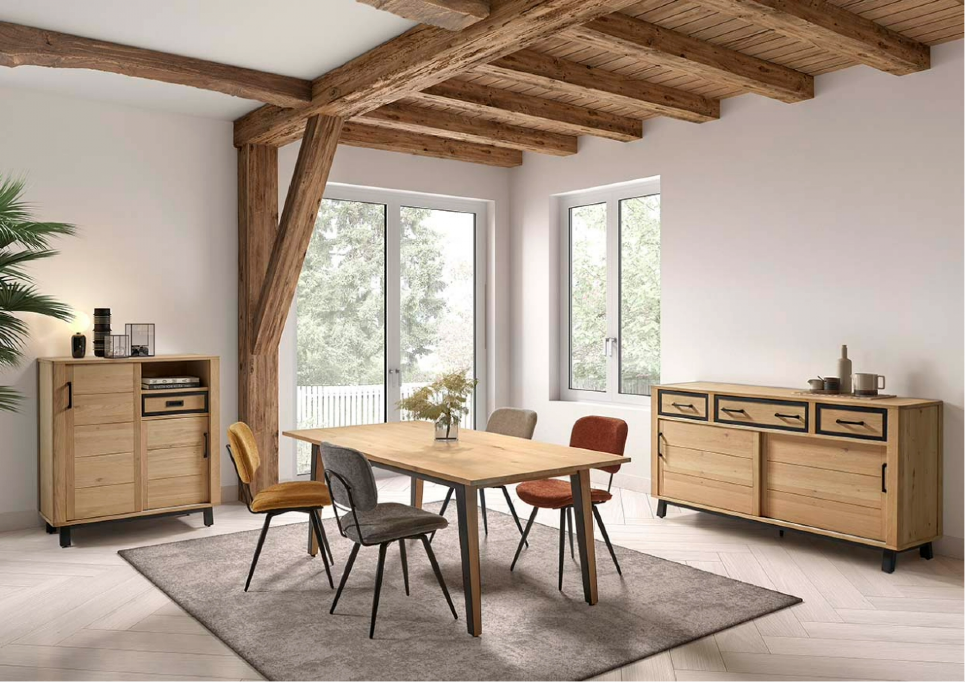 Détails Industriels : Les piétements métalliques noirs et les encadrements contrastés soulignent un style contemporain très recherché.